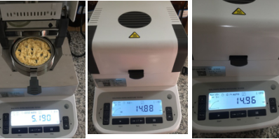 測(cè)試樣品1:用實(shí)驗(yàn)藥勺提取5.1克飼料,置于不銹鋼托盤(pán)中,用實(shí)驗(yàn)藥勺將飼料平鋪均勻,溫度設(shè)置135℃用儀器進(jìn)行加熱,約10分鐘后檢測(cè)結(jié)束,檢測(cè)數(shù)據(jù)顯示14.96%;