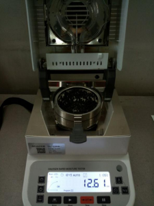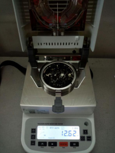 • 測(cè)試種子顆粒1:為了使測(cè)試過(guò)程中種子水分儀將種子烘干烘透,我們將種子分散開(kāi)來(lái),以便溫度能滲透進(jìn)種子內(nèi)部。取5克種子顆粒撒于不銹鋼托盤(pán)中,用鑷子將種子顆粒平鋪均勻,為避免種子烘烤后變焦,我們將溫度設(shè)置在135℃,按“START”鍵開(kāi)始測(cè)試,18分49秒后檢測(cè)結(jié)束,檢測(cè)數(shù)據(jù)顯示12.61%;