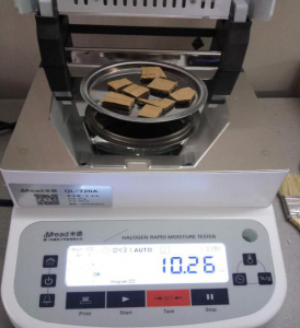 測(cè)試樣品:剪取2克紙皮,置于不銹鋼托盤(pán)中,將紙皮平鋪均勻,溫度設(shè)置120℃用儀器進(jìn)行加熱,約5分鐘后檢測(cè)結(jié)束,檢測(cè)數(shù)據(jù)顯示10.26%;