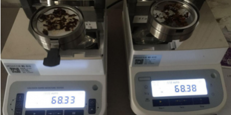 用實驗藥勺提取7.1克醬菜,置于不銹鋼托盤中,用實驗藥勺將面粉平鋪均勻,溫度設(shè)置135℃用儀器進行加熱,約6分鐘后檢測結(jié)束,檢測數(shù)據(jù)顯示12.77%;為了檢測儀器的精確性,待儀器溫度降至50℃以下時進行第二次測試,用實驗勺提取6.8克醬菜,置于不銹鋼托盤中,用實驗藥勺將醬菜平鋪均勻,溫度設(shè)置150℃用儀器進行加熱,約7分鐘后檢測結(jié)束,檢測數(shù)據(jù)顯示12.74%;?用實驗藥勺提取7克醬菜,置于不銹鋼托盤中,用實驗藥勺將醬菜平鋪均勻,溫度設(shè)置150℃用儀器進行加熱,約8分鐘后檢測結(jié)束,檢測數(shù)據(jù)顯示12.73%。實驗結(jié)果所得數(shù)值較為準確,儀器檢測精度較高。