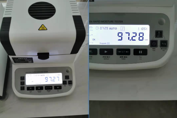 第一步、給測試儀接上電源,調(diào)整水平后按清零鍵。在稱量盤上墊層玻璃纖維紙,取6克左右乳膠放上面,用實驗勺輕輕攪動一下,使乳膠鋪勻在盤中,然后等顯示屏重量數(shù)值不跳了,按START按鍵開始測試。8分鐘24秒后測試結(jié)束, 按STOP鍵。此時屏幕上顯示的是水分值,再按單位鍵,可切換顯示為固含量值。
