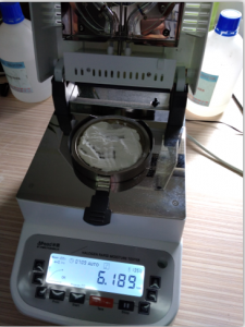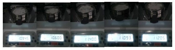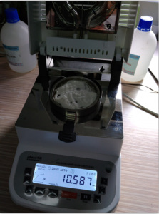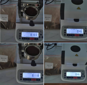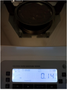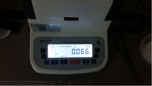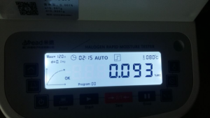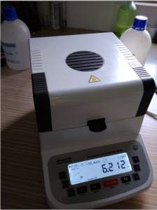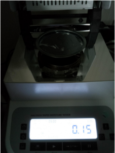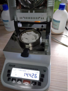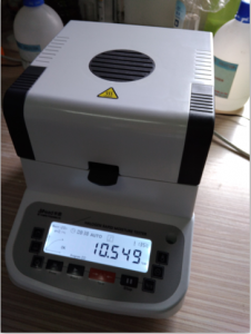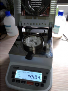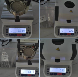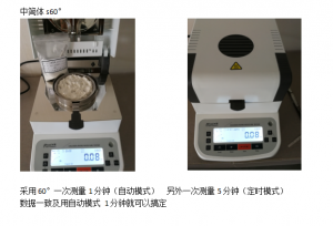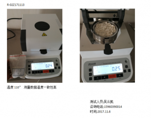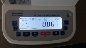 1、測(cè)試陶瓷粉末:為了使測(cè)試過(guò)程中將陶瓷粉末烘干烘透,我們將陶瓷粉末分散開來(lái),以便溫度能滲透進(jìn)陶瓷粉末內(nèi)部。取8克多陶瓷粉末撒于不銹鋼托盤中,用鑷子將陶瓷粉末平鋪均勻,為使陶瓷粉末經(jīng)過(guò)高溫度加熱后能夠徹底烘干,我們將溫度設(shè)置在105℃,按“START”鍵開始測(cè)試,1分鐘37秒后檢測(cè)結(jié)束,檢測(cè)數(shù)據(jù)顯示0.30%;