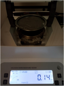 2、為了得到更精確穩(wěn)定的數(shù)據(jù)結(jié)果,在進(jìn)行第二次測(cè)試過(guò)程前先等待陶瓷粉末水分儀降溫,待水分儀本身冷卻至40度以下時(shí),這次我們一樣取8克多陶瓷粉末,將陶瓷粉末平鋪均勻,這次我們把溫度依然控制在105℃,這次我們采用自動(dòng)測(cè)試模式。按“START”鍵開始測(cè)試,1分41秒后檢測(cè)結(jié)束,檢測(cè)數(shù)據(jù)顯示0.29%;
