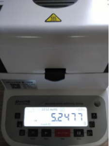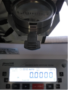 • 測試混合淀粉:為了使測試過程中混合淀粉水分儀將混合淀粉烘干烘透,我們將混合淀粉攤成分散狀,以便溫度能滲透進(jìn)去。取5克左右混合淀粉末置于不銹鋼托盤中,用鑷子將混合淀粉末平鋪均勻,為避免混合淀粉烘烤后變焦,我們將溫度設(shè)置在135℃,按“START”鍵開始測試,7分55秒后檢測結(jié)束,檢測數(shù)據(jù)顯示14.404%;